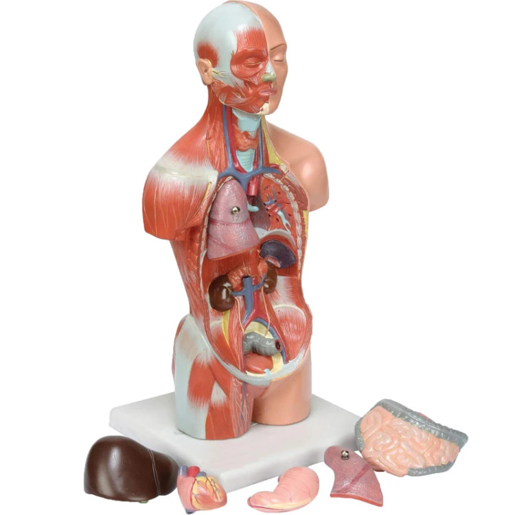 این مدل یک وسیله جذاب ومفید کمک آموزشی وسرگرمی است که برای آموزش آناتومی بدن انسان سر،گردن ونیم تنه فوقانی مناسب است.این مدل ازجنس pvcنشکن وفاقدماده سرطانزای آزبست است ورنگهای به کاررفته بدون سرب وکاملا بی ضرر ومقاوم است که جزئیات اندام ها منطبق باواقعیت روی آن نقاشی حرفه ای شده است که ازویژگیهای منحصربفرداین مدل توجه به ریزه کاری هابادقت بالای علمی میباشددارای 7قطعه است که به راحتی تفکیک وجاگذاری می شوند: شش راست و چپ ( دوقطعه)، قلب (دوقطعه)، کبد، معده، روده کوچک و بزرگ و پانکراس( یک قطعه) و بدنه مدل در ناحیه گردن غضروف حنجره وغده تیروئید و نای مشاهده می شوند و نیز ماهیچه های صورت و تنه و ران در نیمه راست دیده می شوند. این مدل مناسب هدیه به دانش آموزان کنجکاووخلاق ،مطب های پزشکان،آزمایشگاه ها،مدارس وکلیه علاقه مندان به ساختاربدن انسان میباشد.